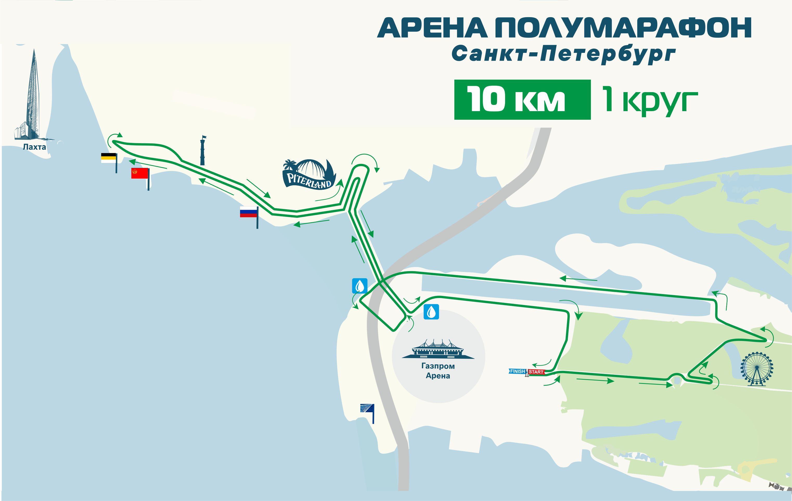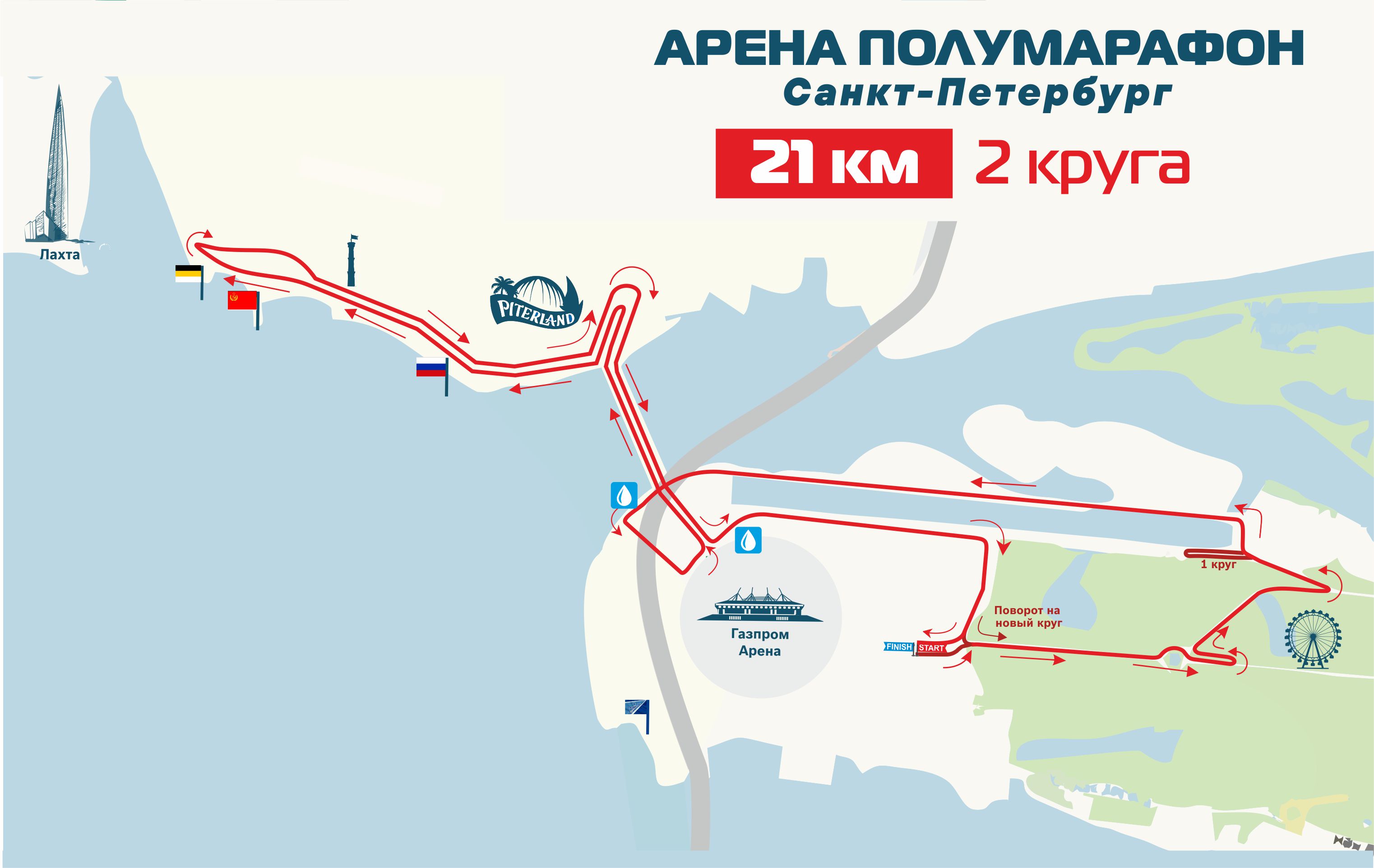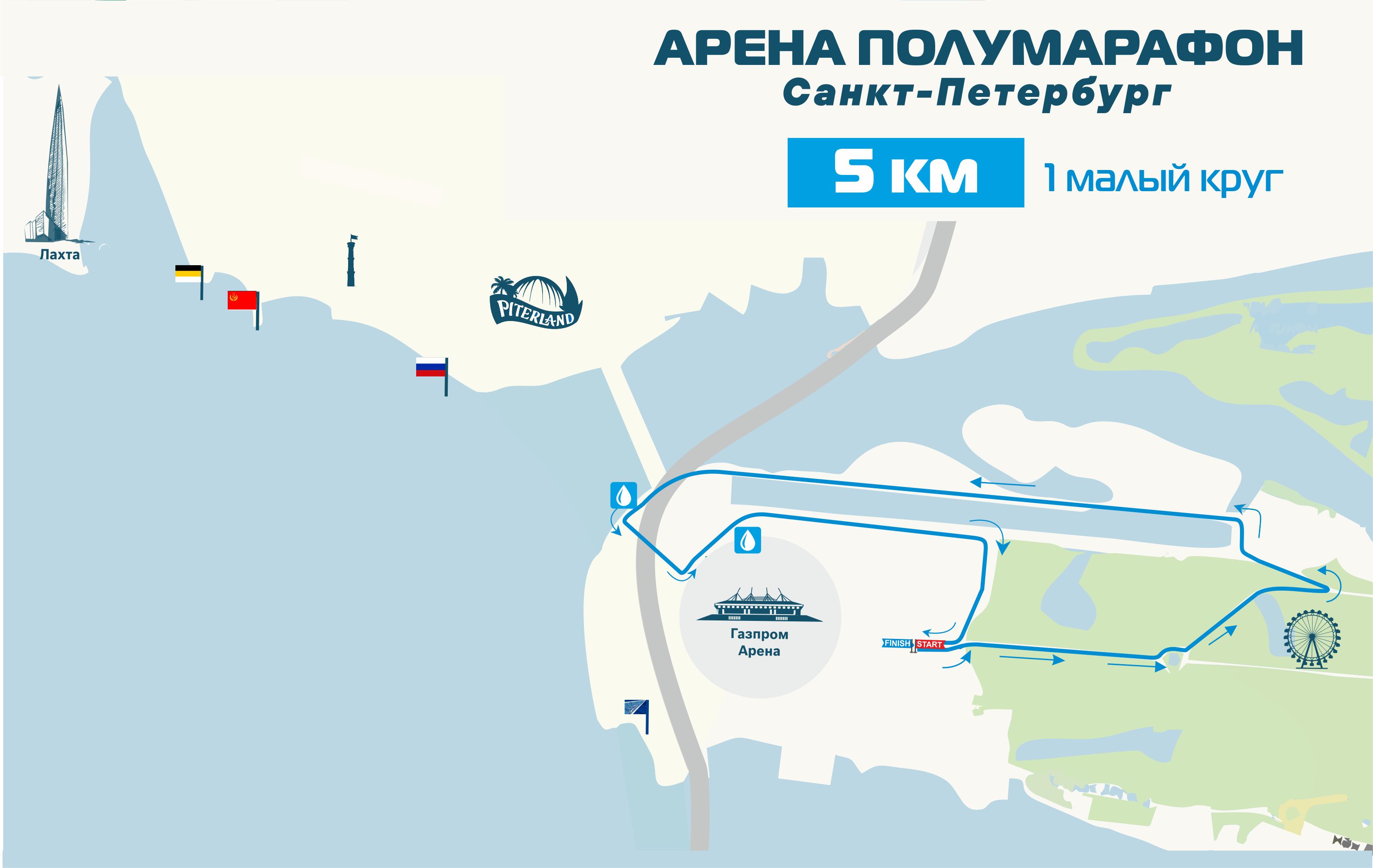 Топовые место старта и трасса! Трасса проложена в месте сформированного ультрасовременного кластера Санкт-Петербурга с атмосферой престижа, энергией успеха и потрясающими видами на новые доминанты города: «Газпром Арена», «Лахта Центр», Западный скоростной диаметр (ЗСД), Яхтенный мост.