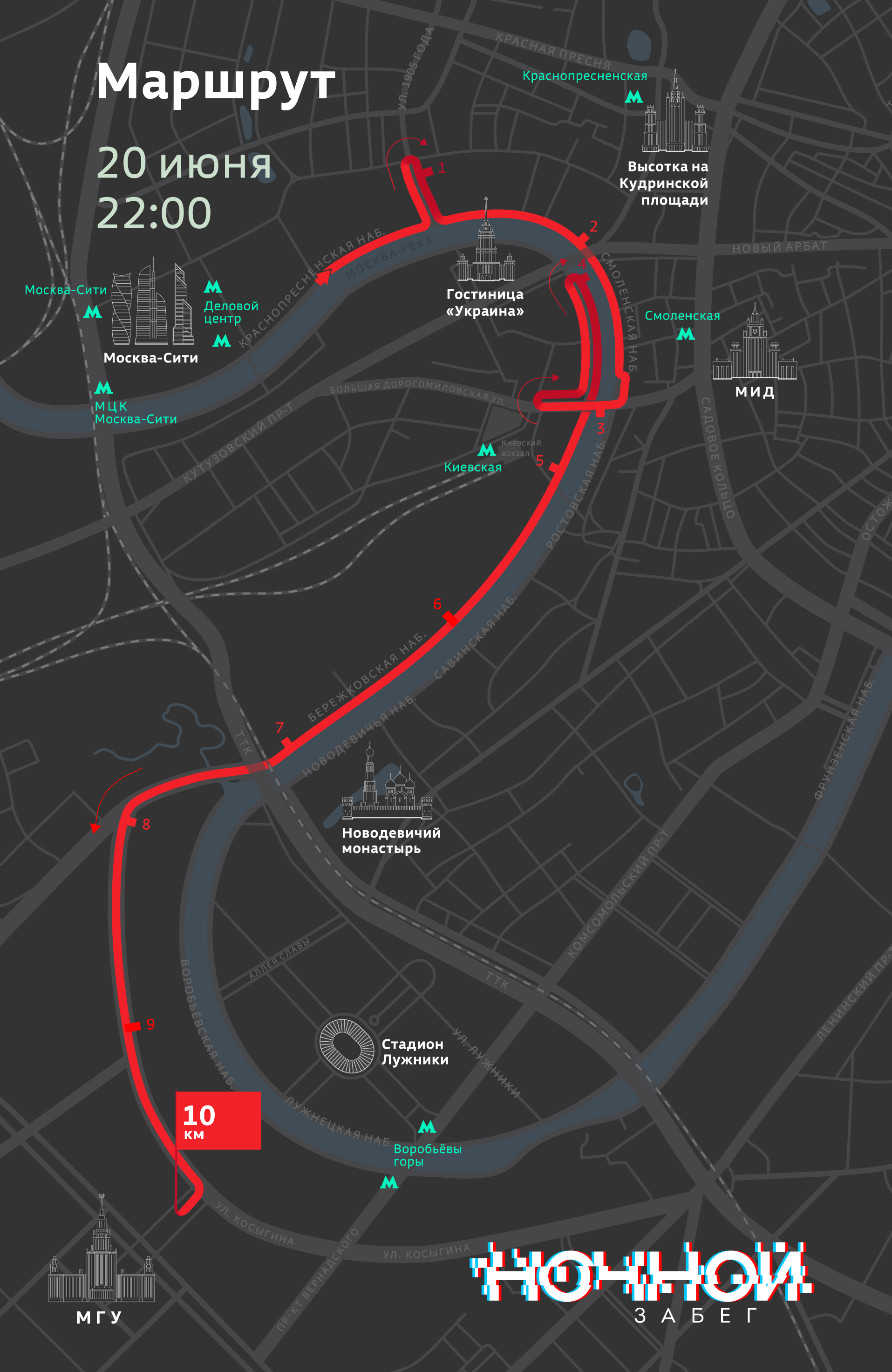 - 22:00 Старт забега на Краснопресненской набережной.