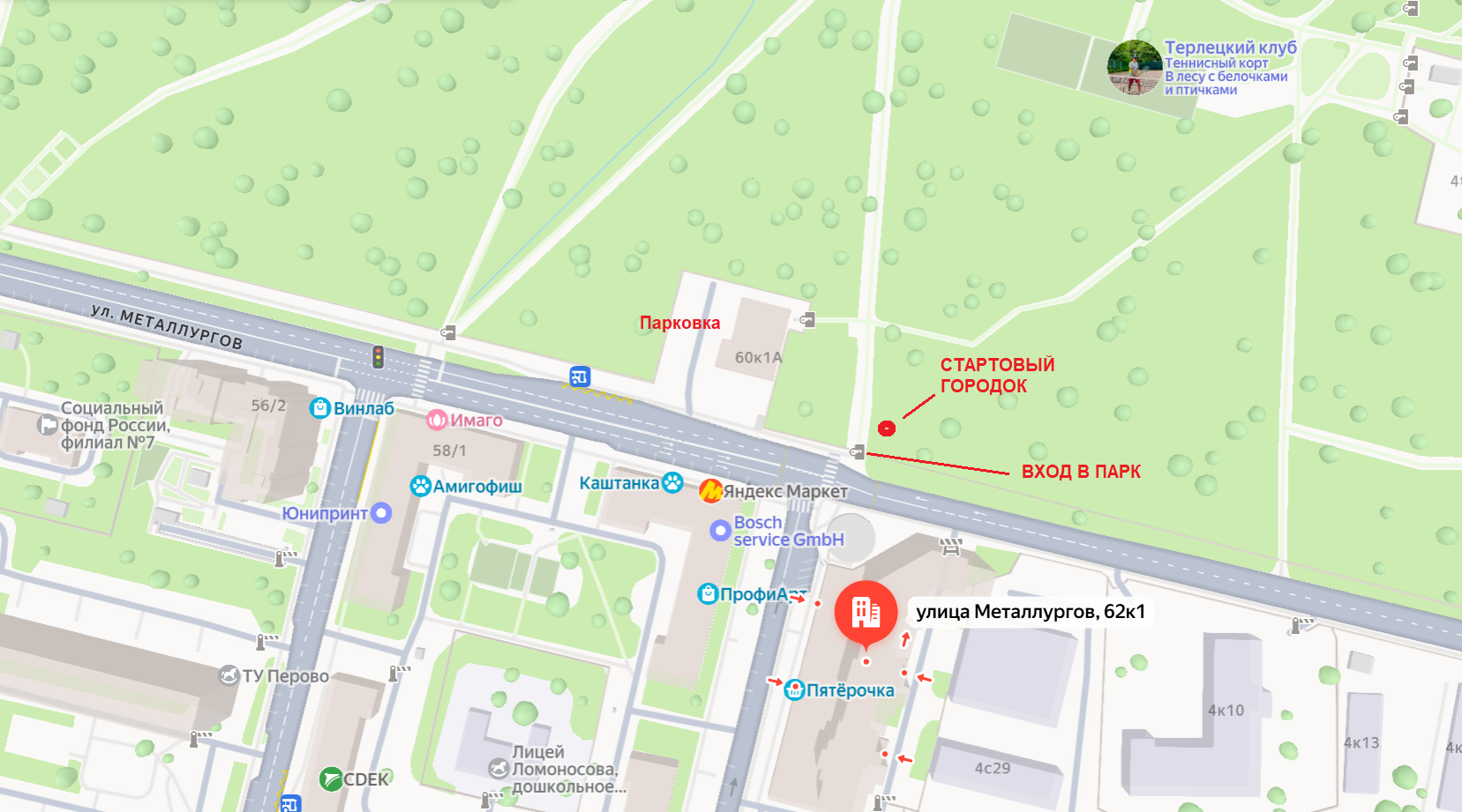 Стартовый городок расположен: вход в Парк - напротив дома по адресу улица Металлургов, д. 62 к 1