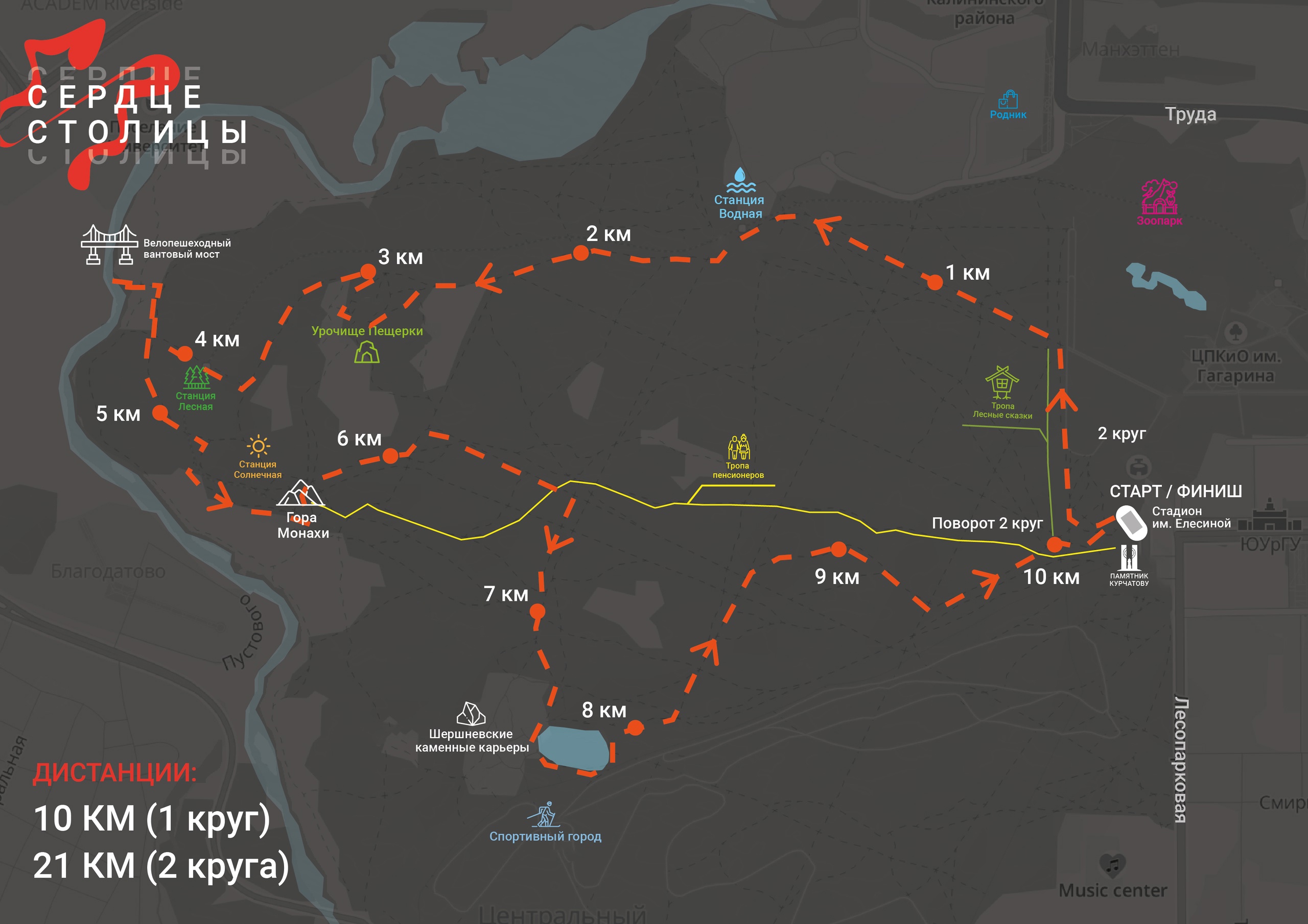 10 км., 21 км. – маршрут стартует со стадиона им. Е. Елесиной, ведет вдоль лыжероллерной трассы на начало тропы «Лесные сказки», основная часть дистанции пройдет до урочища Монахи по эко-тропе «Тропа исследователей» с забеганием на новый мост «РМК – арена» (разворот) и приведет бегунов к студенческому карьеру, затем через «долину сказок» участники пробегут на финиш на стадион им.Е.Елесиной, под драйвовую музыку, сделав «круг почета».